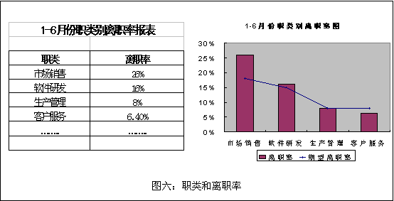 职类的离职分析考查企业中不同职类一定期间(一般大于季)内的离职比例,并与企业设定的期望离职率和人才储备计划作比较。下图表显示的是某个企业上半年度部分职类离职率的示意图。在企业中市场销售和软件研发类员工的离职率是比较高的,但二者也显示出不同的信息。该企业对软件研发人员的期望离职率(反映企业在这个职类淘汰率等信息)与实际离职率基本相似,证明对这部分人员的管理是行之有效的,离职率也是在企业预期和控制范围内的;但市场销售人员的离职率却是远远高于企业的预期离职率,因而,对这部分员工的管理政策需要重新检讨和改善。而对于生产管理和客户服务两部分离职率较低的人员,其认识方式则恰恰相反。对客户服务类员工来说,员工离职率未达到企业期望的水平,一般说明企业对这类员工的竞争淘汰机制未能有效的建立起来,或者中低层管理人员对这部分员工的评价有着特殊的考虑,等等。