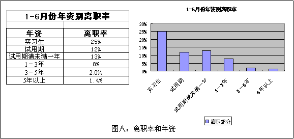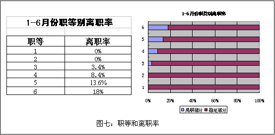 上面图表是对一个企业上半年度职等别离职率的示意图表。其离职率有效的控制在低层,即4到6等左右,是一种良性的管理状况。该企业对高职等员工采取了定向关怀政策,定期对这些员工进行访谈,了解他们的具体要求并针对性采取一些服务和管理措施;而对于低职等的员工,通常采用宏观政策控制,利用员工代表访谈会等形式建立企业和员工之间的互动关系,引导员工舆论。这种管理方式也是企业中常见的形式。职等别的离职率分析的作用是给企业中的高层管理者一个预警的功能,当发现企业中高层的离职率有上升趋势时,及时去检讨和校正具体的管理中的不足之处。