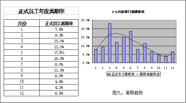 就离职分析而言,离职率的发展趋势有着相当重要的意义。从某一角度短期分析得到的结论可能受到短期各种外界因素的影响从而失真,经常需要对多期连续考查确认离职率的期望值,最终解析管理上的原因;另一方面,管理方面诊断得到的结论应用到管理改善上,其改善效果也需要下降离职率的反馈来验证。离职趋势分析中,重要的是做到对离职率计算方式的选择,在第三节离职度量方法中对此已经有了较多的讨论,人力资源管理者应该根据企业目前的发展阶段以及考查对象的特征选择适合的离职度量方法。对于离职的趋势发展,分析者可以结合移动平均法、线性回归法、多项式回归法、指数回归法等多种统计方式,排除无关因素的影响,得到离职率最真实的发展趋势。