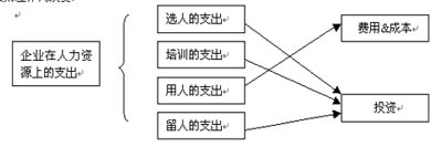 上述种种方法都是在原有财务指标上的补充。而现在批评的火力逐渐指向现行财务制度本身。以收益为基础的财务绩效指标,通常反对对新技术、新市场及人力上的投资,而这是在全球市场、知识资本日益重要的今天取得佳绩不可或缺的条件。一般说来,企业聘用一个员工的支出可以分为四个部分,一是选人的支出,二是训练的支出,三是用人的支出,四是留人的支出,如图所示。这几项支出中真正是费用的只有第三项(用人的支出),而其他几项则应作为投资,